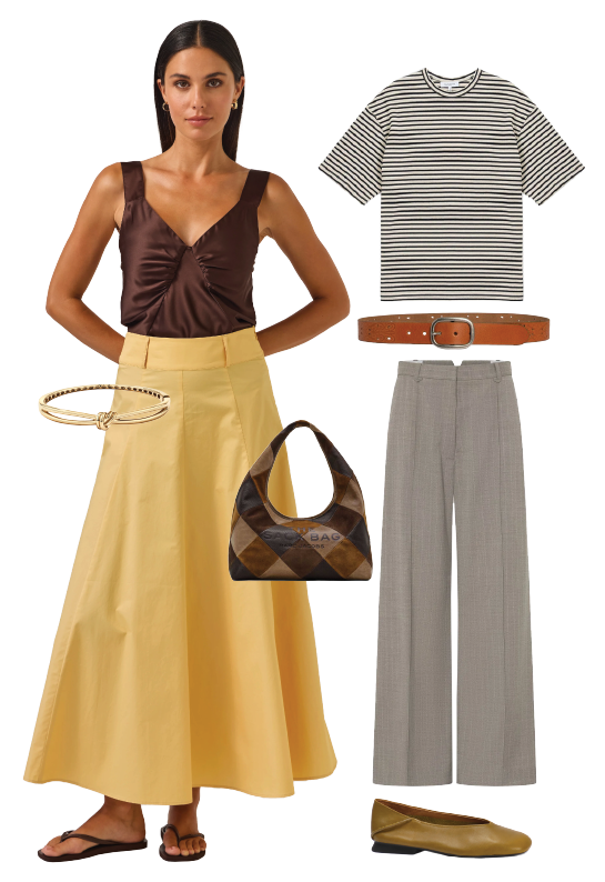 Riveria cami and circle skirt, Tuesday Label. Knot Split Band oval bangle in 10kt yellow gold, Michael Hill. The Suede Patchwork Sack Bag, Marc Jacobs. Lotus tee, Superette. Alexis leather belt, Estilo Boutique. Arnelle tailored natural pinstripe pant, Camilla and Marc. Natalie Camper ballerina flat, Mikko Shoes.