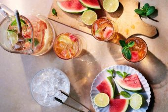 Ingredients 150ml Vodka 50ml Cointreau or Grand Marnier 1/2 watermelon (deseeded) 2 limes, cut into quarters 800ml Fever-Tree Ginger Ale Mint sprigs, to garnish Method Fill a pitcher three-quarters full with ice cubes. Pour over the vodka and Cointreau or Grand Marnier. Cut a few cubes of the watermelon and set aside for […]
