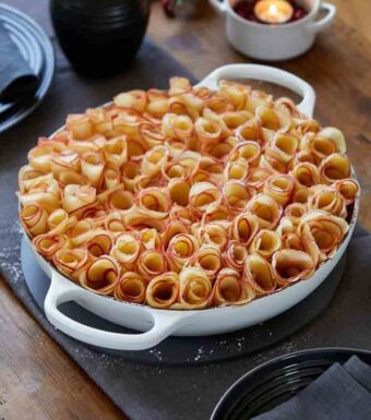 Courtesy of Le Creuset. Ingredients BISCUIT BASE 400g ginger crunch biscuits, finely blitzed 110g butter ½ jar crystallised ginger FRANGIPANE 150g butter 150g caster sugar 4 organic/free-range large eggs 2 teaspoons almond extract ¼ teaspoon vanilla paste 150g ground almonds TOPPING 20 pink lady apples, sliced with a mandoline into rounds 250ml […]