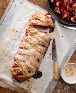 Rhubarb, raspberry & ginger strudel braid