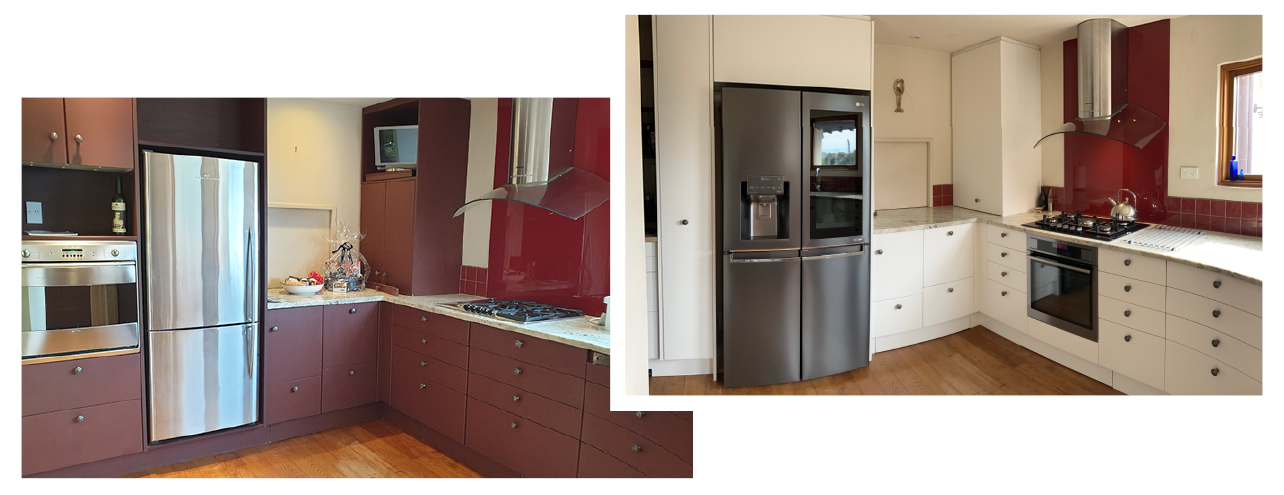Before and after: MF Turnbull upgrades to this kitchen in Diamond Harbour included moving the oven, altering the fridge cavity, and a repaint.